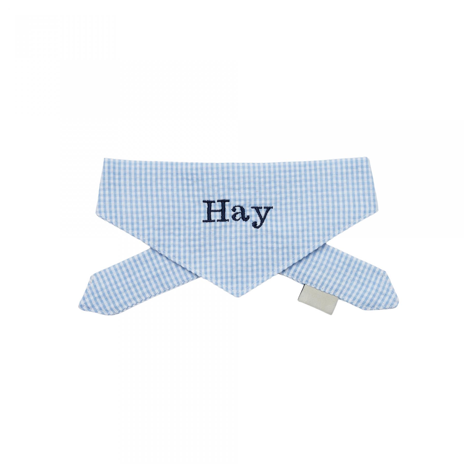 子犬の名前を刺繍してポイントとして着用するネーミングスカーフです。